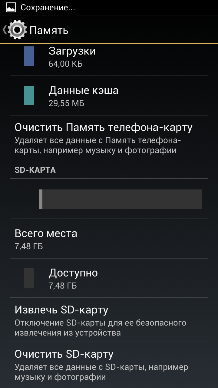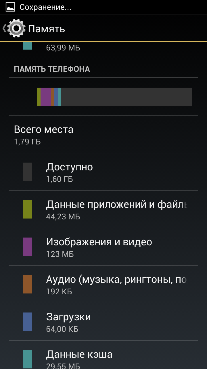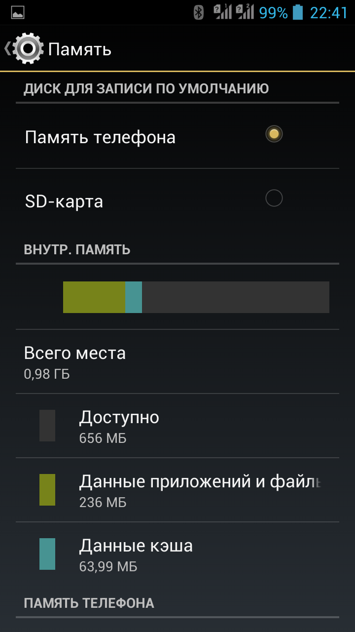 Из заявленных 4 ГБ встроенной пользовательской памяти на практике доступно немногим меньше двух: 0,98 ГБ – внутренняя память на основе встроенного FLASH-накопителя, а еще 1,79 ГБ – внутренняя память телефона.