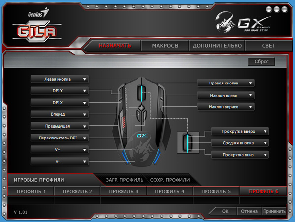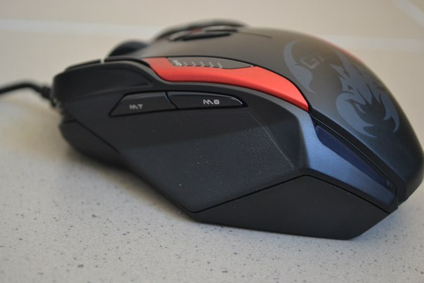 Арсенал кнопок и GX Gila немаленький. Так, к примеру, на верхней панели шесть свободно программирующихся клавиш, кнопка регулировки чувствительности курса, а также традиционные клавиши правого/левого нажатия мышки и колесико прокрутки страниц.