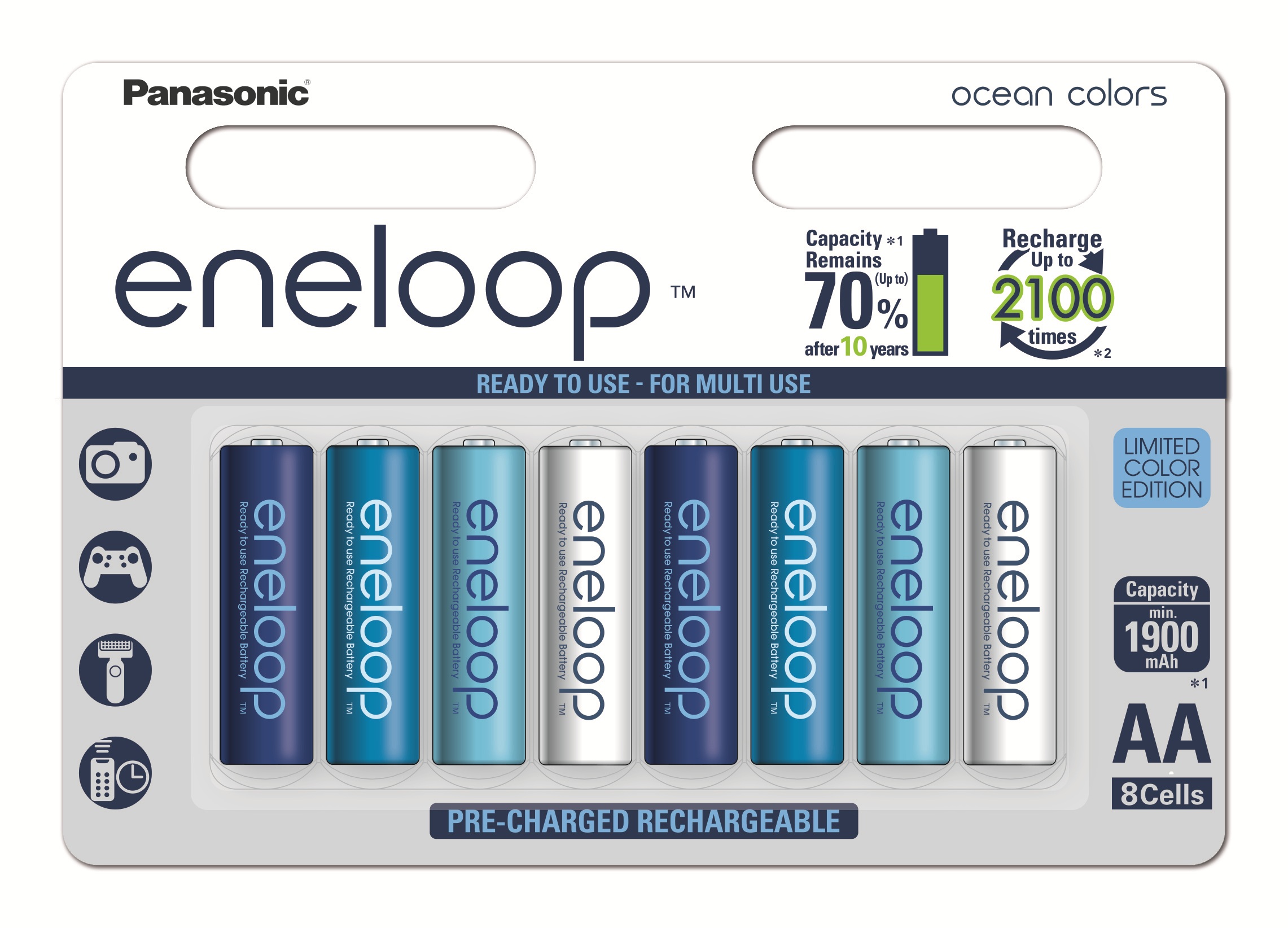 В следующем году компания Panasonic рассчитывает получить награду iF design award за серию eneloop ocean colors. За основу для цветового решения аккумуляторов был взят океан, как символ чистоты и энергии. Четыре оттенка синего: глубоководный синий (grand blue), изумрудно-синий (emerald blue), светло-синий (lite blue) и символизирующий морскую пену – белый цвет (white). В каждый набор включены по два аккумулятора каждого цвета.
