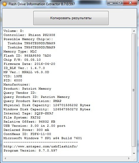 Посредством популярной утилиты Flash Drive Information Extractor, удалось выяснить, что «на борту» изучаемой модели «связка», состоящая из памяти MCL производства японской Toshiba и контроллера Phison PS2308.