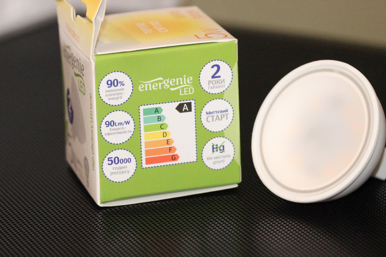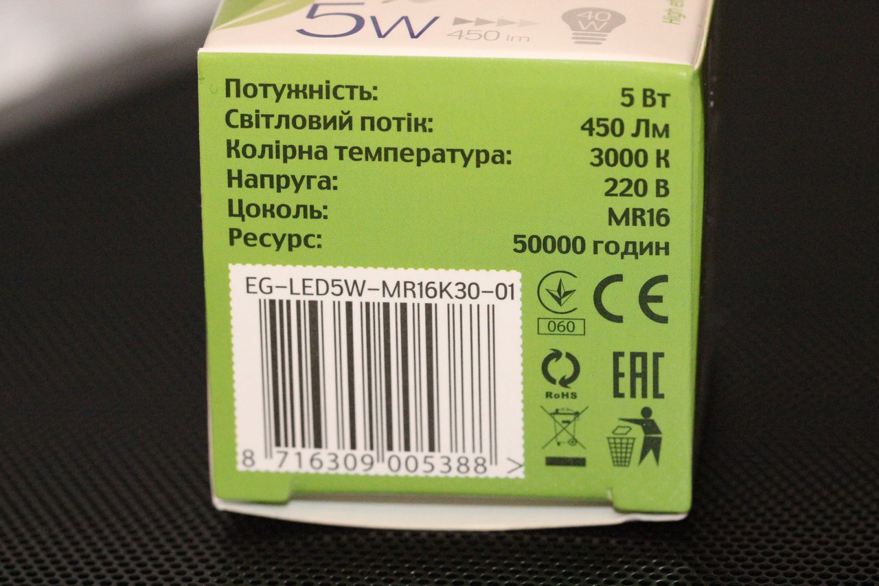 Едва ли не все особенности EG-LED5W-MR16K30-01 можно будет изучить, осматривая стенки коробки, в которой поставляется продукт. Конечно же, приятен сам по себе и дизайн упаковки, но, как по мне, информация на стенках важнее: метка гарантии, мощность и эквивалент мощности лампы накаливания, класс энергопотребления, отсутствие ртути, теплый или холодный свет и мн. др. полезные сведения.