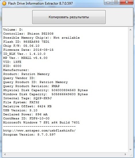 Посредством программы Flash Drive Information Extractor мне удалось выяснить, что внутри носителя популярный контроллер PS2308.