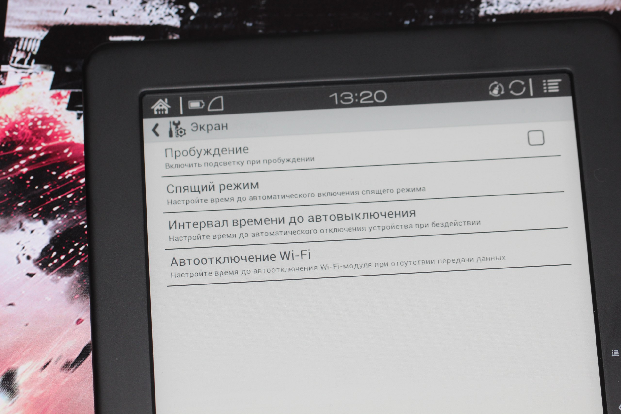 Относительно настроек, в соответствующем подменю – это возможность активировать автоматическое включение подсветки при выходе устройства из режима сна, настроить тайм-аут перехода в спящий режим, выбрать интервал автоматического отключения ридера и отключения модуля Wi-Fi при определенном периоде отсутствия сетевой активности.