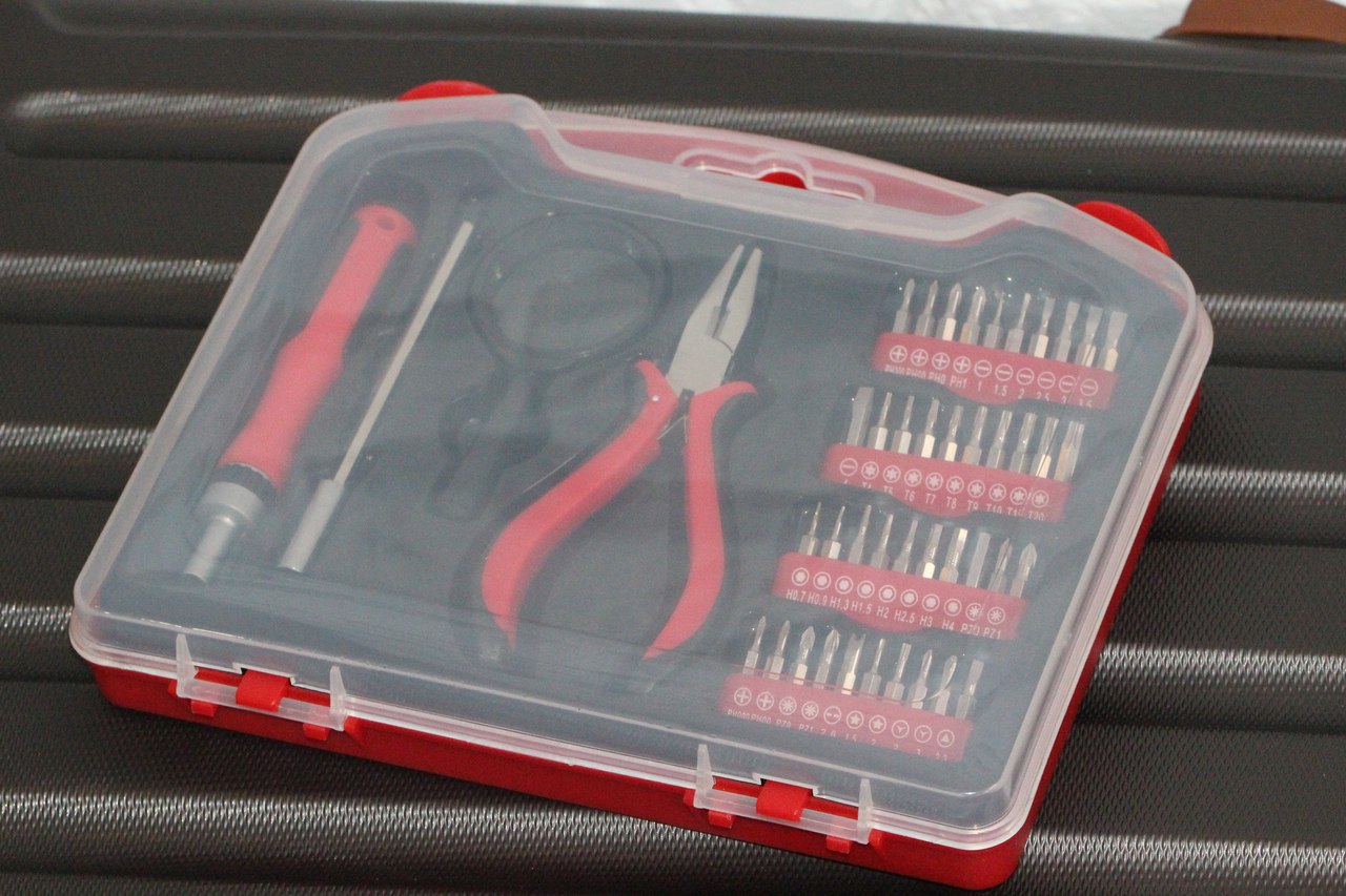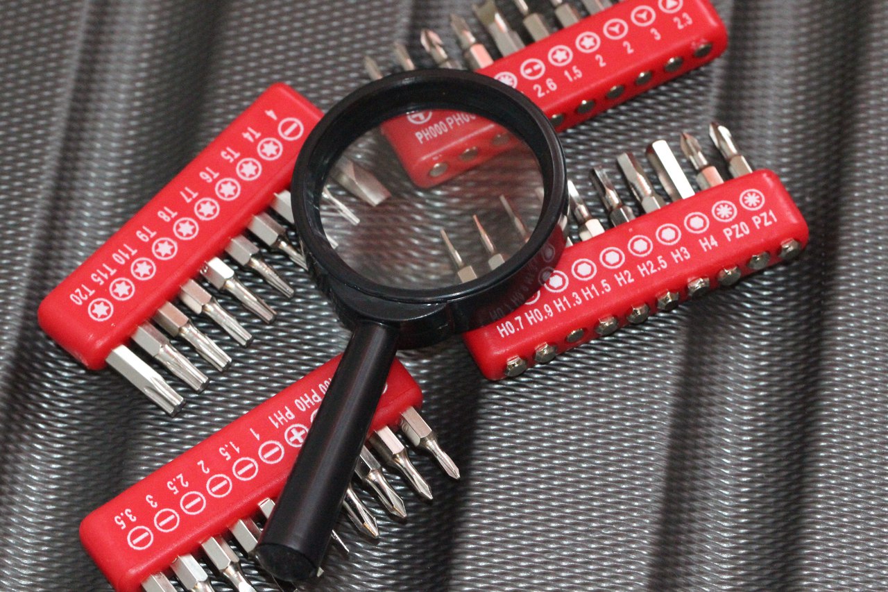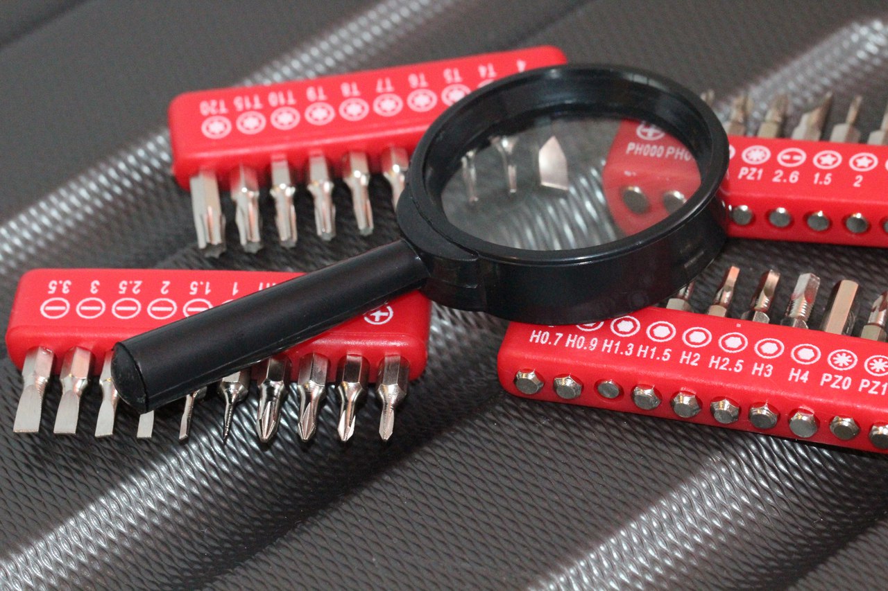 Что ж, таким образом, перед нами компактный набор инструментов для работы с различными мелкими приборами и деталями. Удобная отвертка, есть удлинитель, лупа для людей с ослабленным зрением либо же для работы с очень мелкими компонентами плюс огромное количество бит, едва ли не под все существующие крепежи.