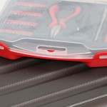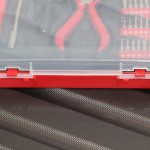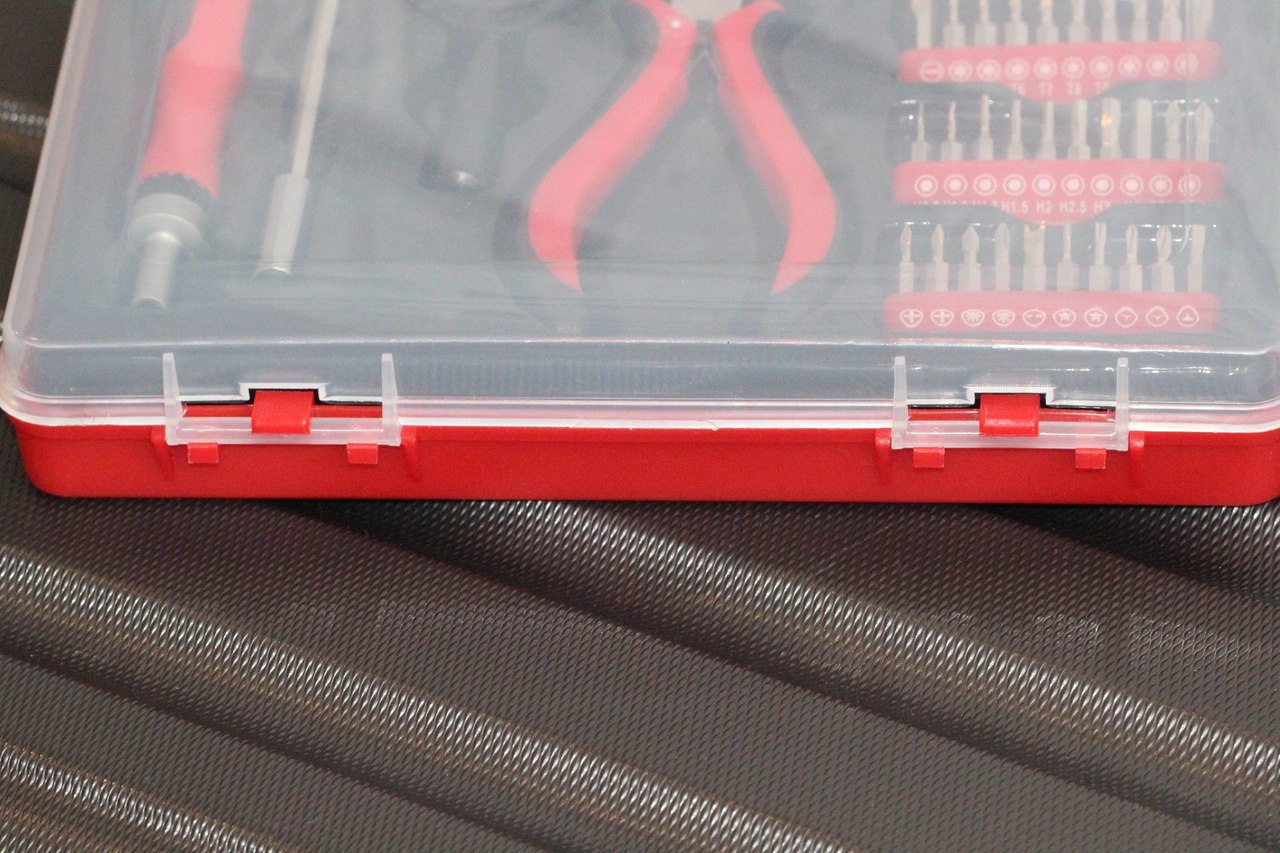 Как и в случае с ранее рассмотренным набором TK-SD-04, в изучаемом здесь продукте также пластиковый короб красного цвета, а сама же крышка молочно-прозрачного формата, разумеется, если так можно вообще сказать. Через нее, кстати говоря, можно вполне неплохо изучить расположение элементов внутри, да и их самых в том числе. К слову, крепление крышки к коробке такое, что при необходимости ее можно совсем снять, поскольку с двух сторон она фиксируется на петлях.