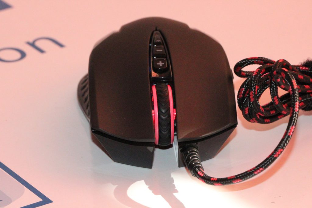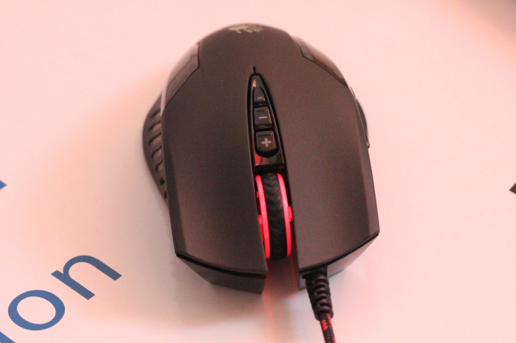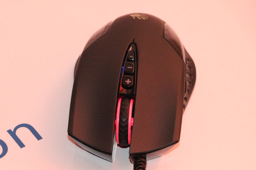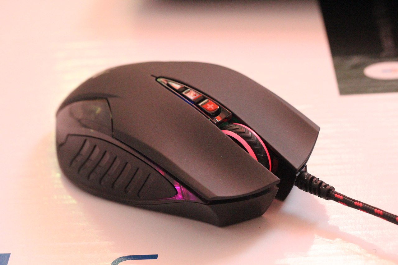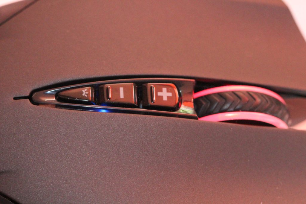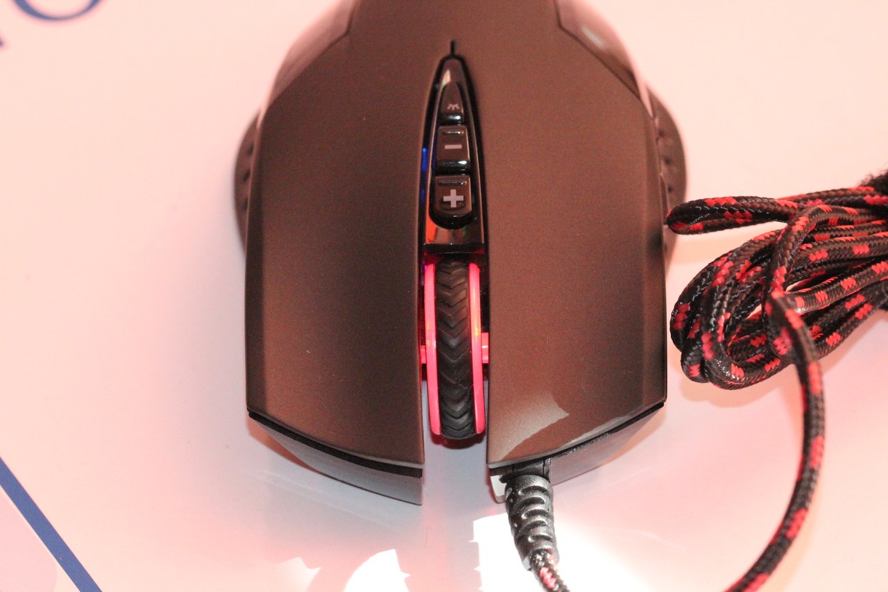 На верхней спинке мышки расположены кнопки правого/левого нажатий, колесико прокрутки, а также кнопки переключения DPI и клавиша регулировки яркости подсветки. К слову, посредством последнего из отмеченных элементов подсветку можно выключить везде, кроме колесика – там несколько иной формат, ну да к нему мы еще вернемся чуть ниже.