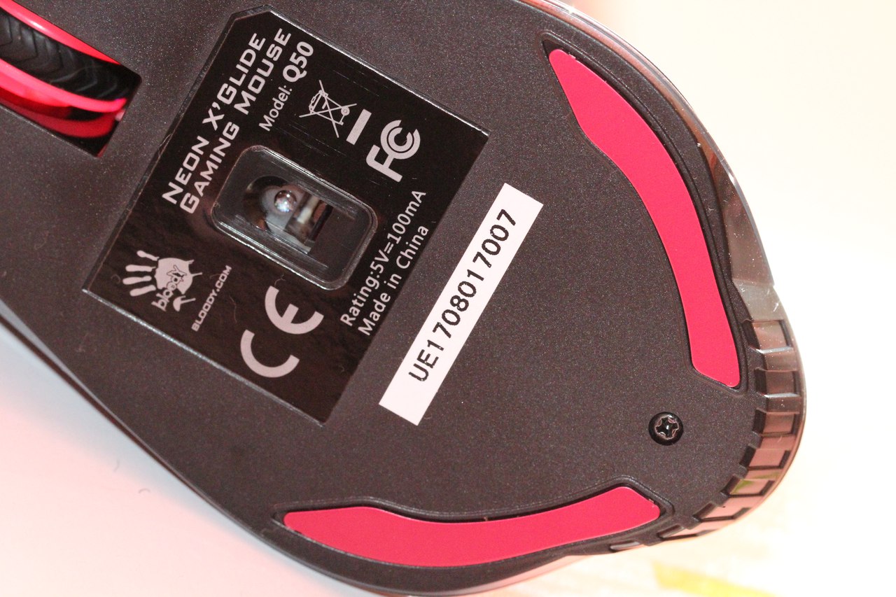 По периметру снизу расположены упомянутые ранее ножки X’Glide, а по центру — порт оптического сенсора и достаточно заметная глянцевая наклейка с различными сведениями на ней.