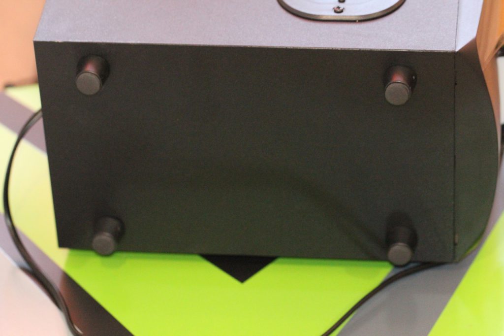 По периметру снизу как у сабвуфера, так и у колонок предусмотрены пропиленовые насадки. В колонках они прикреплены к днищу, а на «сабе» — к ножкам. Перед нами довольно простое, но хорошо зарекомендовавшее себя антивибрационное решение.