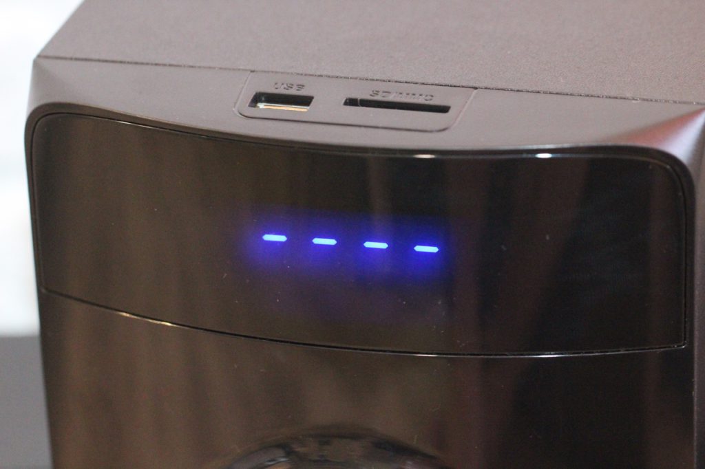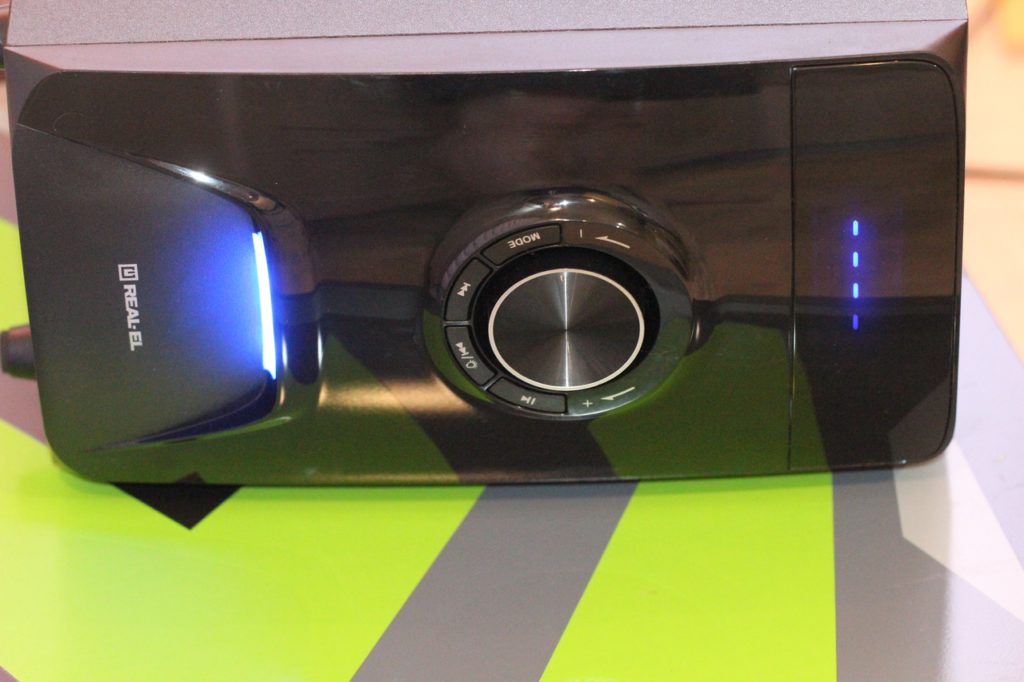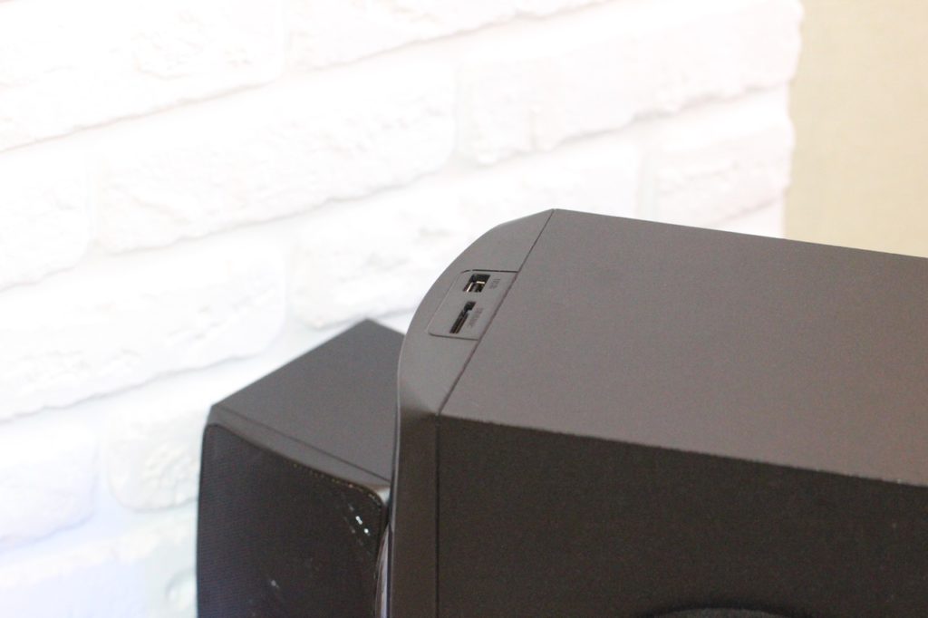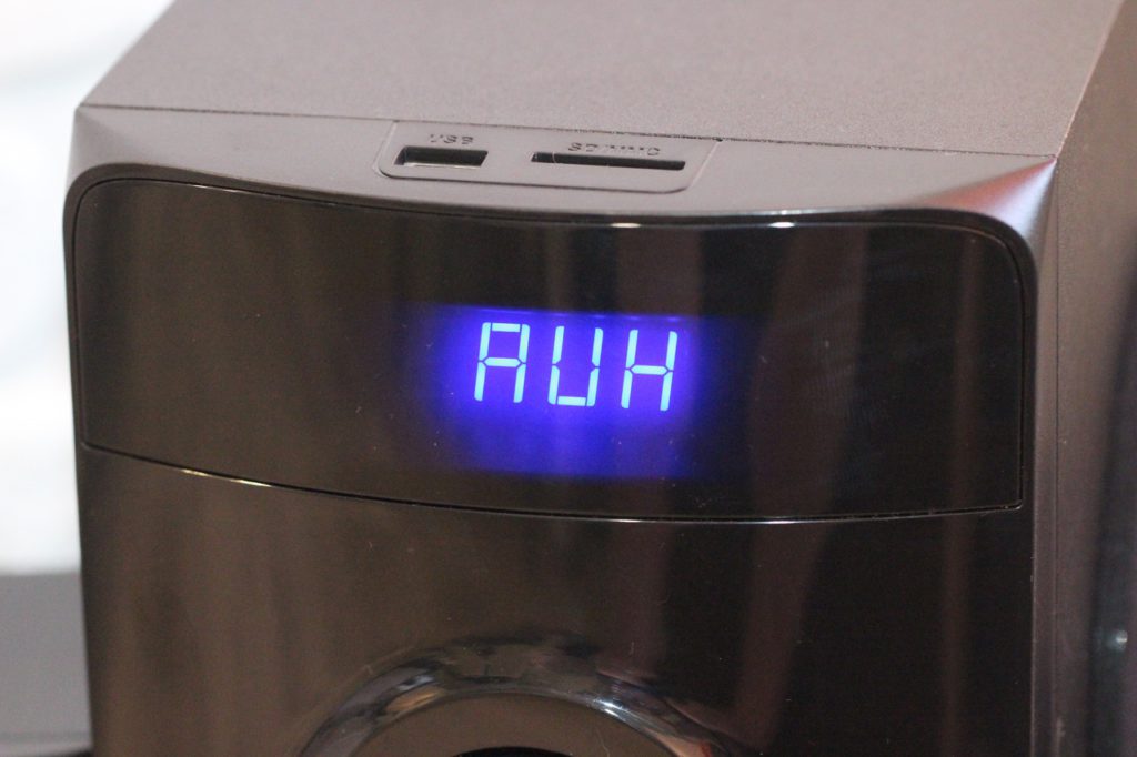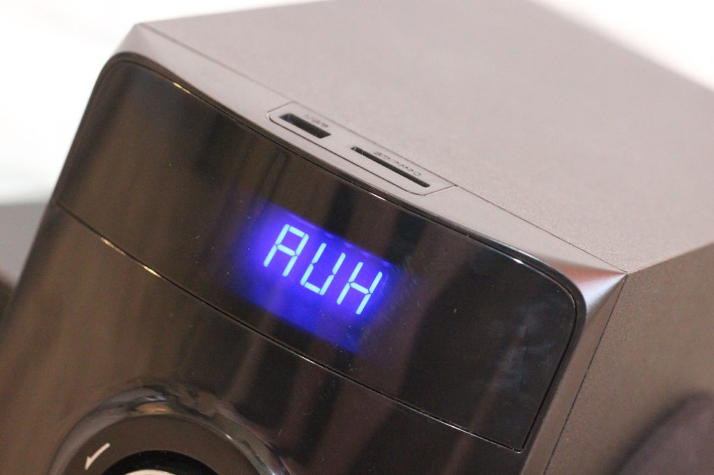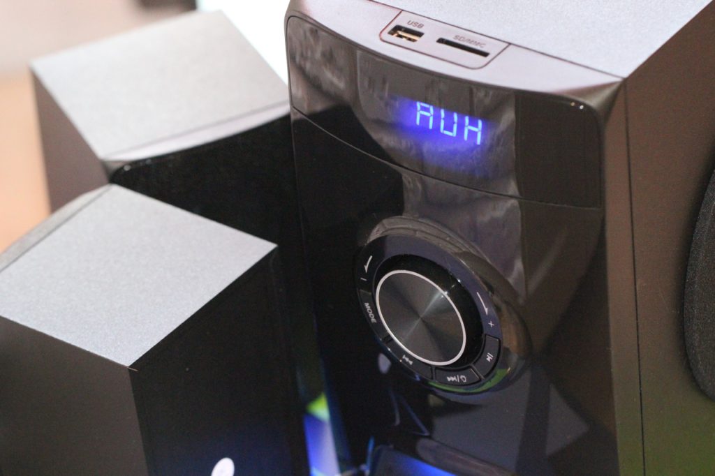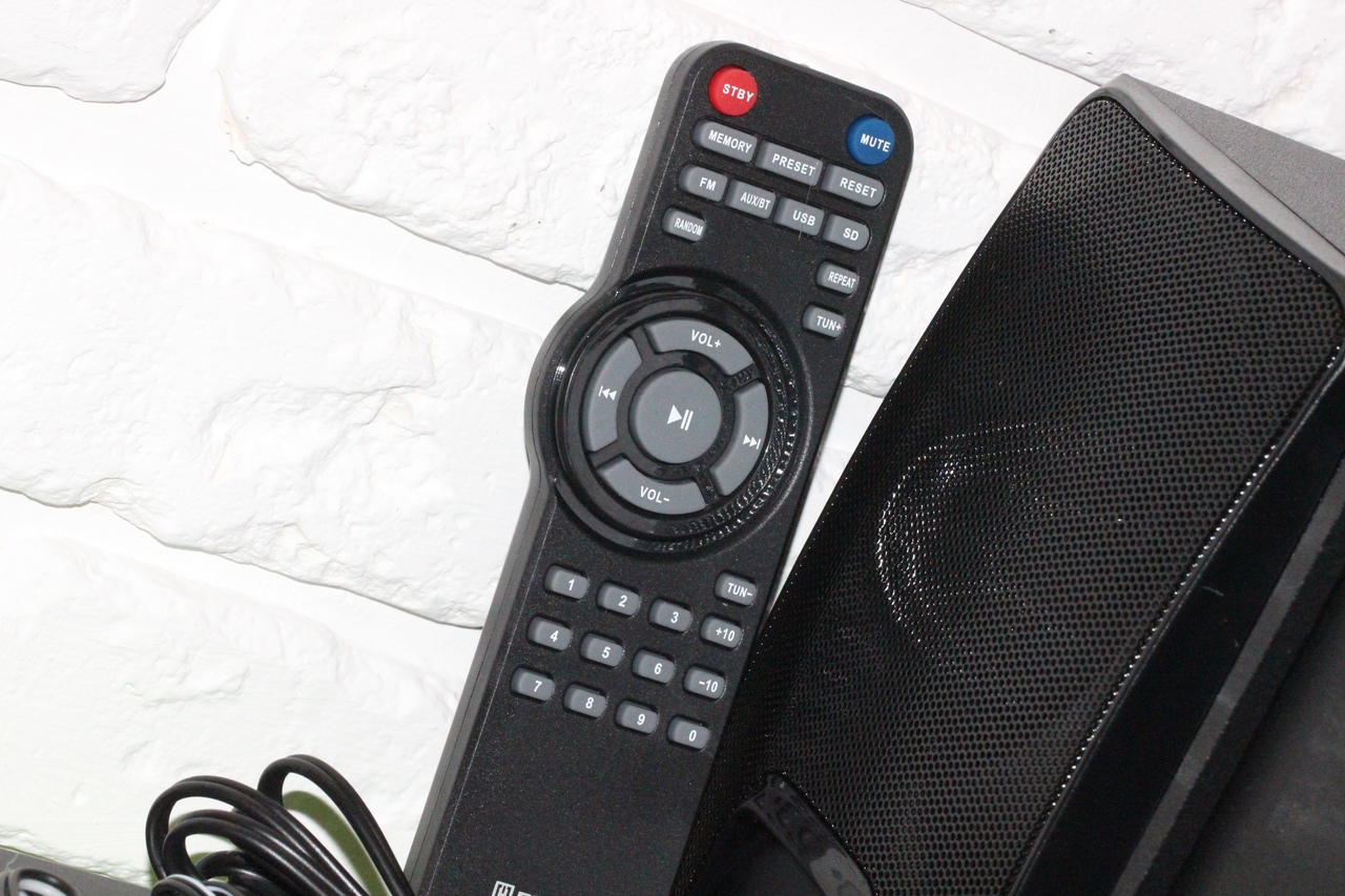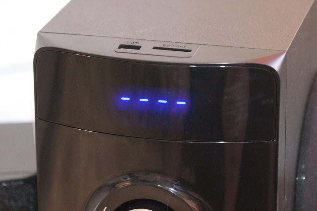 В режим проигрывателя система переходит автоматически, стоит лишь пользователю вставить USB-флешку или SD-карту. Если же накопители вставлены, но в данный момент работает, к примеру, тот же FM-приемник, в таком случае переключение выполняется вручную при помощи пульта ДУ либо же на панели сабвуфера.