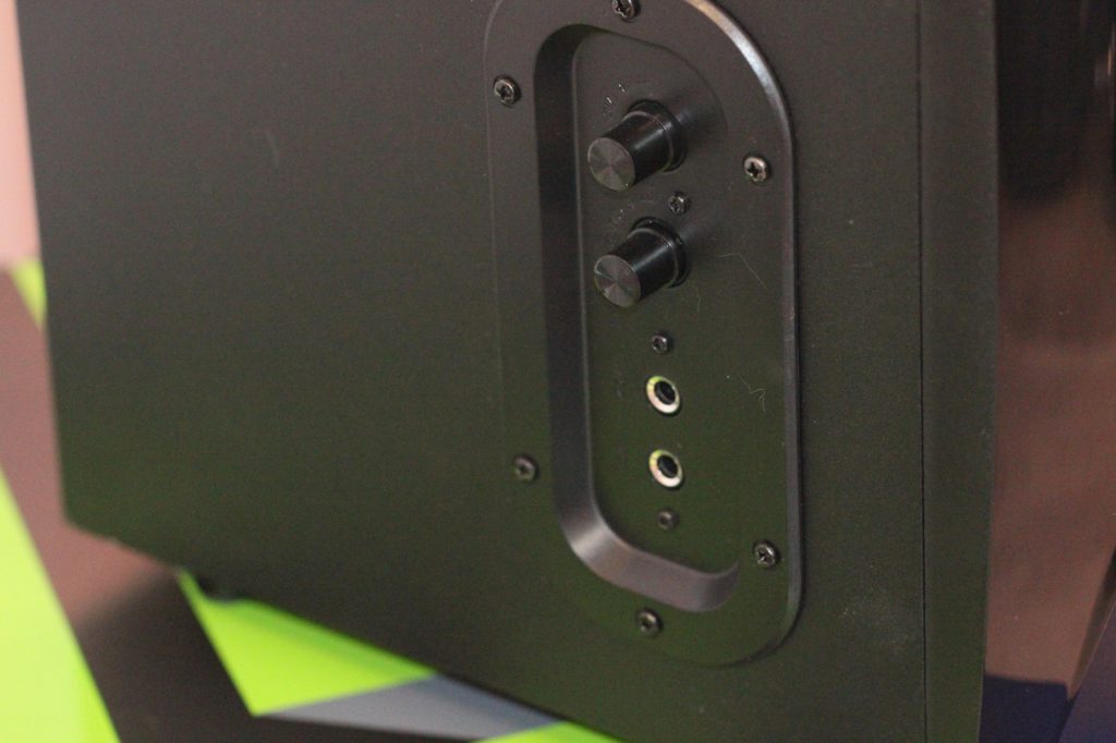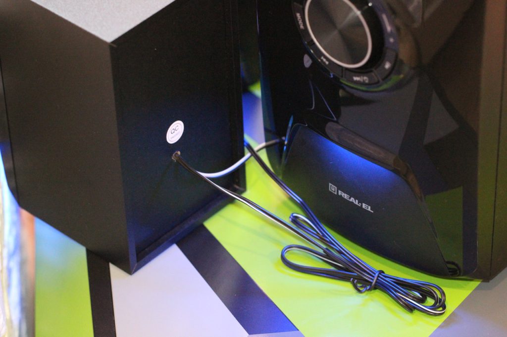 Помимо подсветки сабвуфера, аналогичное решение производитель уготовил и для колонок – соответствующие вставки также спереди внизу. Кроме того, здесь красивые металлические сетки и логотипы бренда, а сзади кабеля подключения к «сабу» для звука и отдельные под работу диодов.