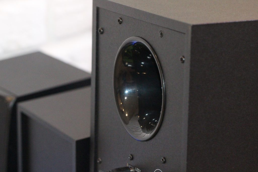 Лично мне понравилось то, что корпус и колонок и сабвуфера из дерева – все за исключением передних панелей. Последняя у «саба» пластиковая, а у колонок практически полностью прикрывается металлической сеткой. Немного пластика спереди, впрочем, есть и здесь.
