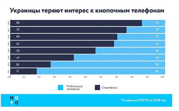 В 2011 году смартфоны в общей доле продаж составляли 17%. В 2014 году показатели сравнялись — продажи «кнопочников» и смартфонов были почти 1 к 1, а в 2018 ситуация стала кардинально противоположной — продажи кнопочных телефонов составили только 15% от общего числа проданных мобилок.