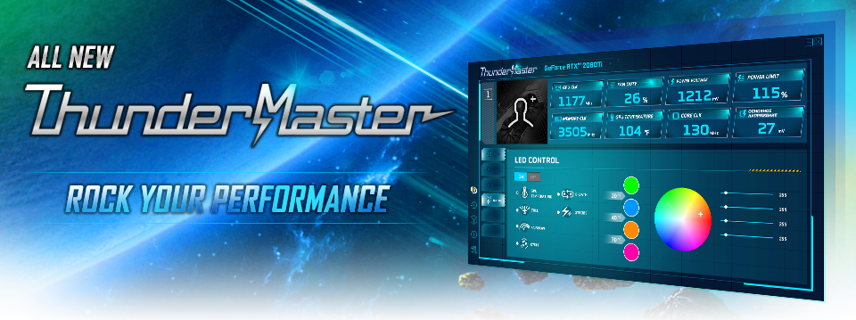 Новая версия утилиты ThunderMaster полностью обновлена по сравнению с предыдущими версиями и имеет более удобный интерфейс и персонализированные настройки. С ThunderMaster пользователь может отслеживать параметры видеокарты, а также настраивать разгон, обороты вентиляторов и эффекты LED подстветки.