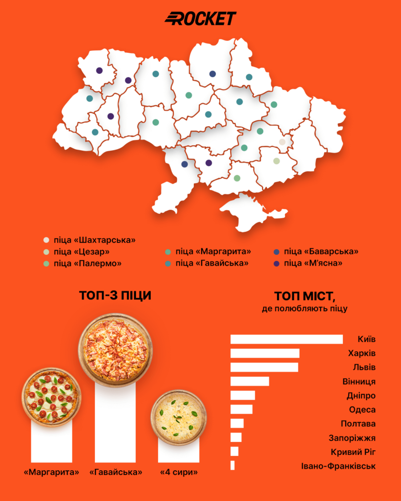 Всего за 2020 год курьеры Rocket доставили в Украине свыше 300 тыс. заказов с пиццей. Чтобы оценить масштаб этой цифры — представьте 5 футбольных полей, полностью укрытых пиццей. Из них самой популярной пиццей оказалась «Гавайская». Второе место за «Маргаритой», тогда как третье за «Четыре сыра».