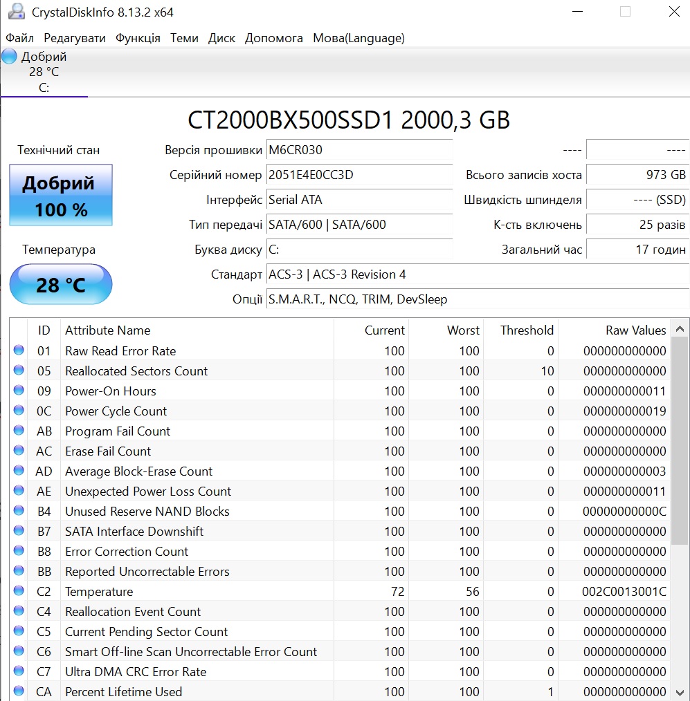Далее перейдем к приложению CrystalDiskInfo и узнаем с его помощью за поддерживаемые Crucial BX500 2ТБ функции и технологии: