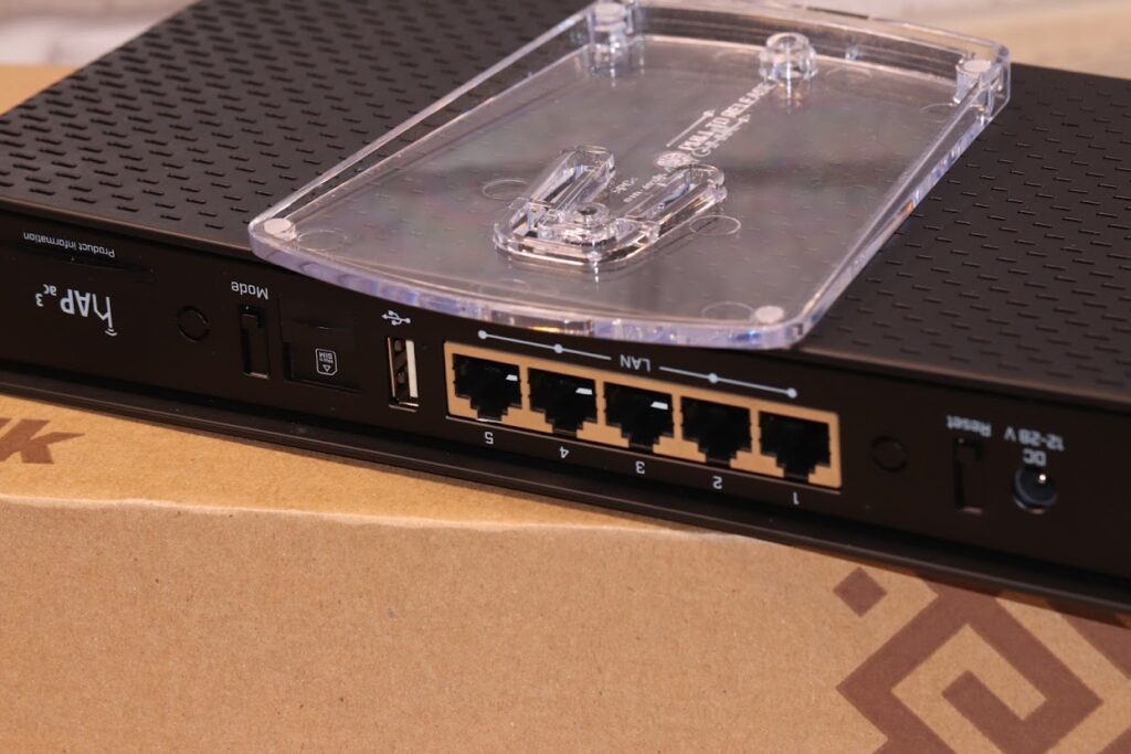 Очень интересной получилась интерфейсная панель, которую вынесли на противоположную «боковушку». Здесь 5 гигабитных портов, слот под SIM-карту, разъем питания, кнопки Reset и Mode, а еще порт USB 2.0 + небольшая пластиковая «выезжающая» табличка с различной технической информацией.