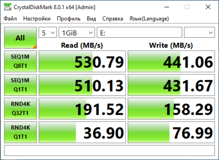 - максимальна послідовна швидкість читання/запису – до 520/430 МБ/с;
