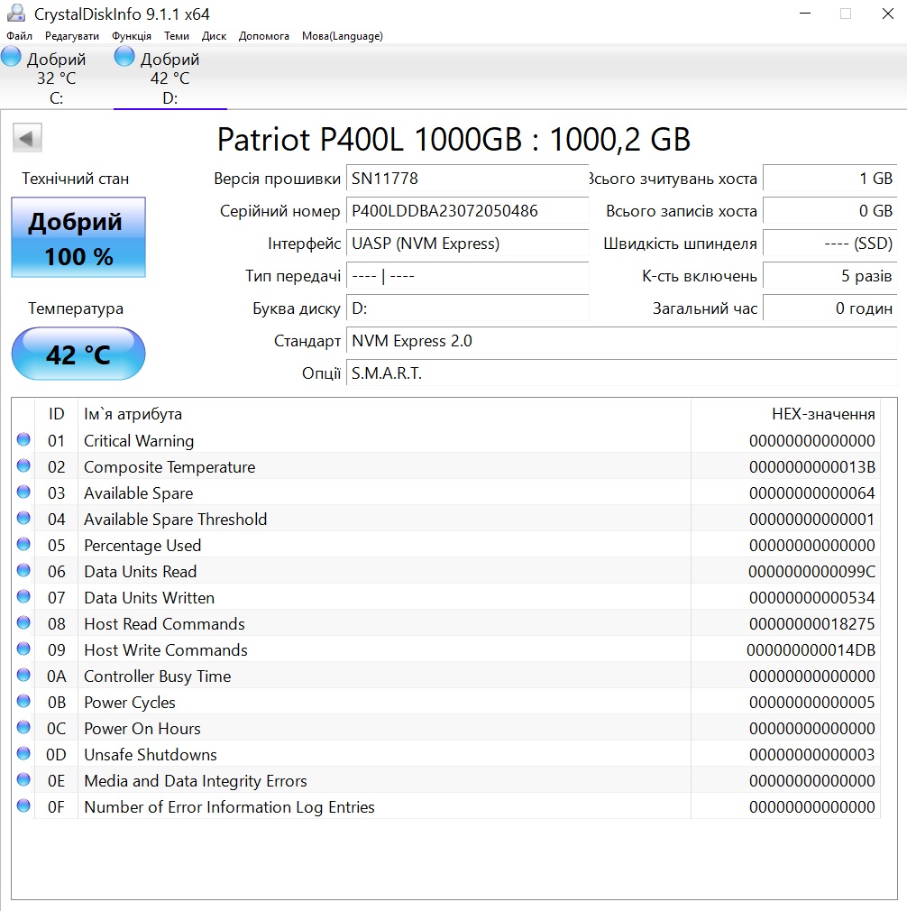 Далі знайомимося з результатами дослідження нашого «підопічного» в CrystalDiskInfo.