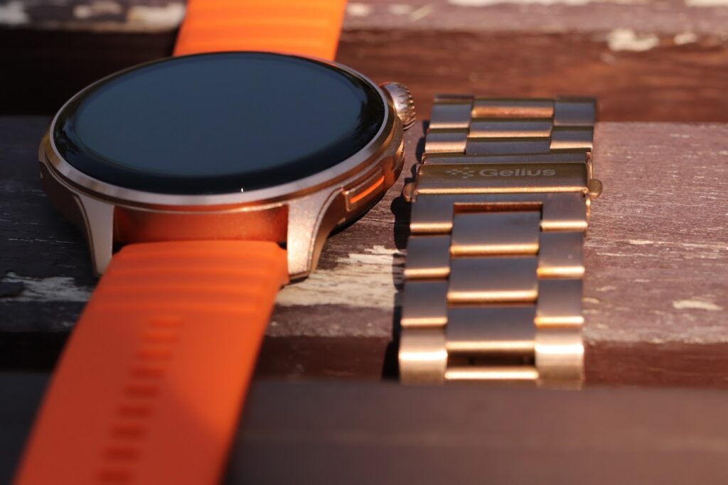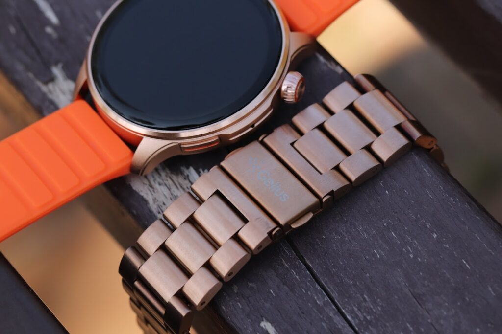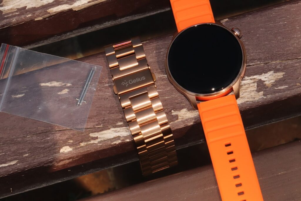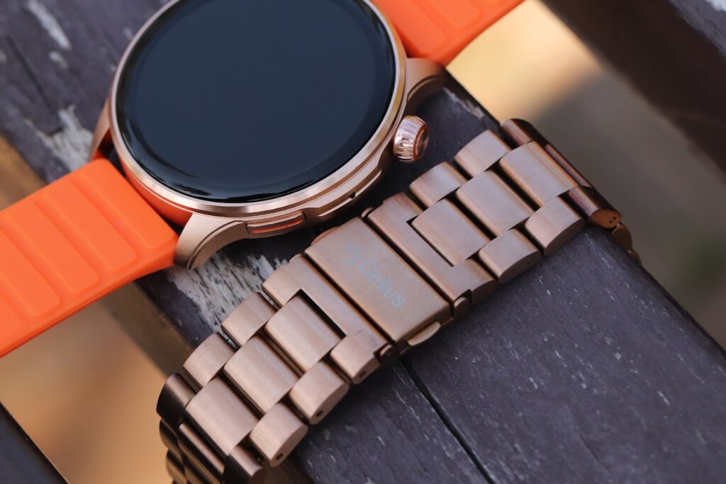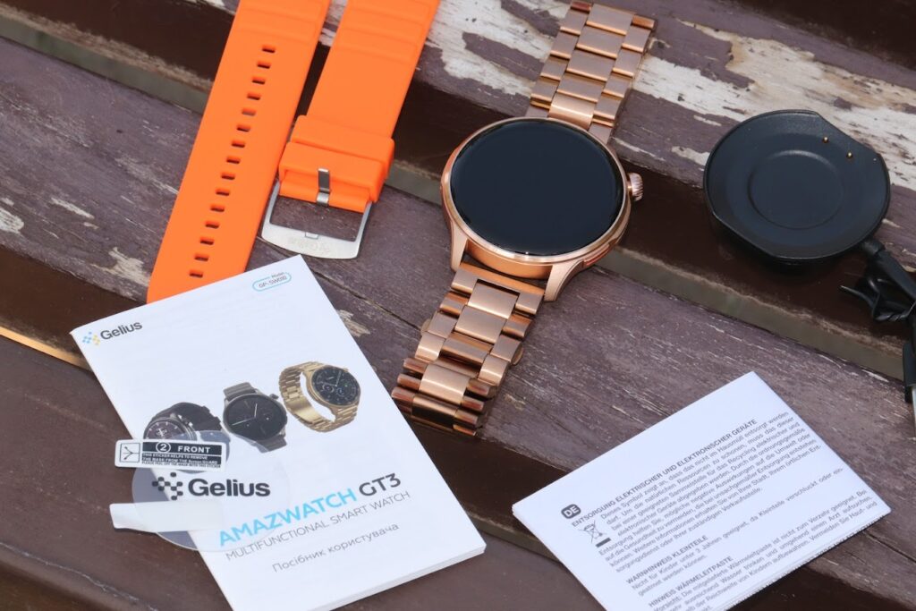 Подарунком до кожного Gelius Amazwatch GT3 GP-SW010 є ремінець. У випадку нашої моделі в «золотому» кольорі він помаранчевий. Якщо ж будете купувати чорну версію годинника або ж сіру, там колір ремінця буде відповідним. У тому випадку, якщо помаранчевий колір – не ваш варіант, але годинник хочеться саме «золотий», на сайті бренду можна пошукати інші кольори стандартного 22-милліметрового ремінця. Ну і браслет. Взагалі, на моїй пам’яті це перший годинник такого класу саме з браслетом. З іміджевої точки зору – рішення бездоганне. Стосовно практичної сторони питання, про це дещо згодом.