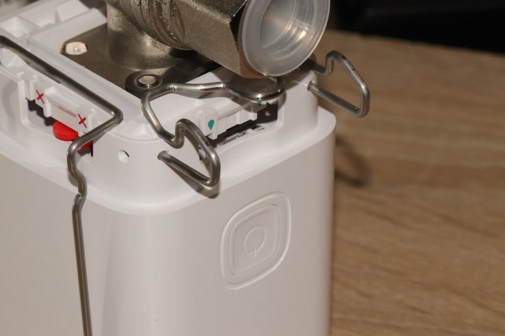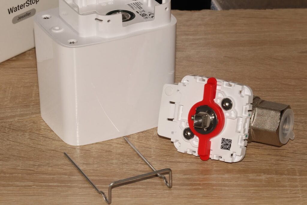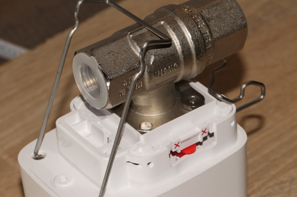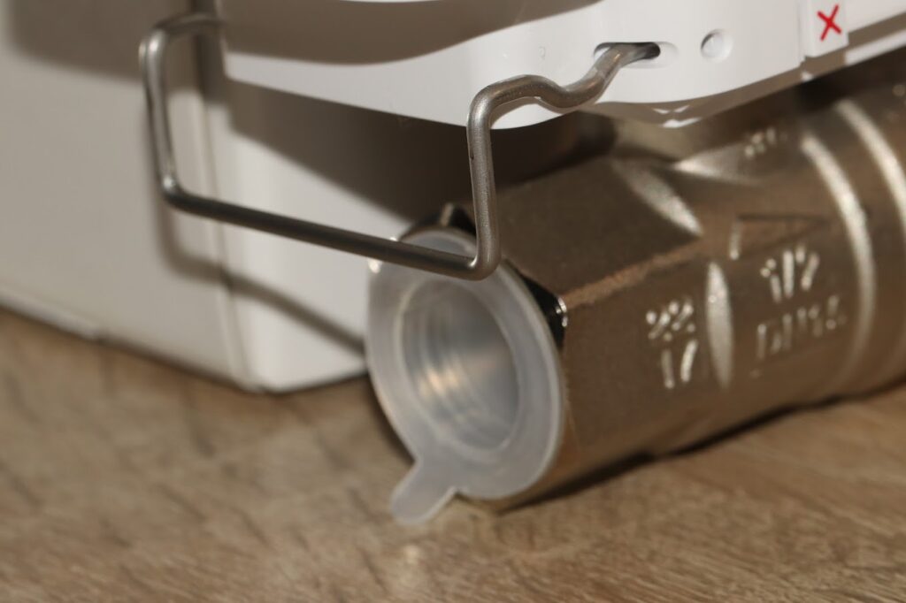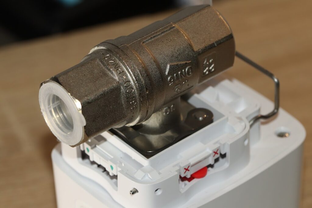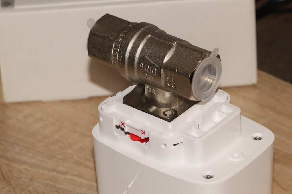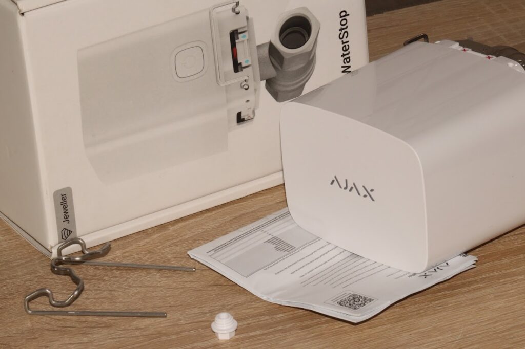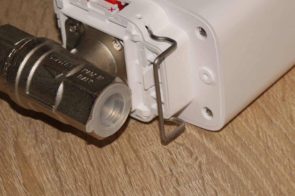 Головні компоненти AjaxWaterStop – це кран з пластиковою платформою для швидкого встановлення, модуль зі вже згаданими батарейками та електропривод. Фіксація цих частин в єдину конструкцію здійснюється за допомогою металевої скоби; по часу кілька секунд, не більше того.