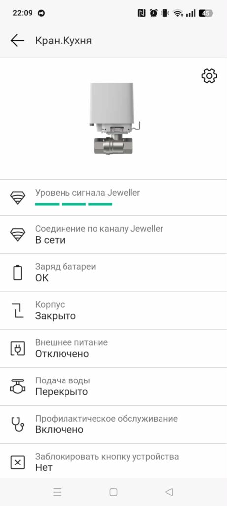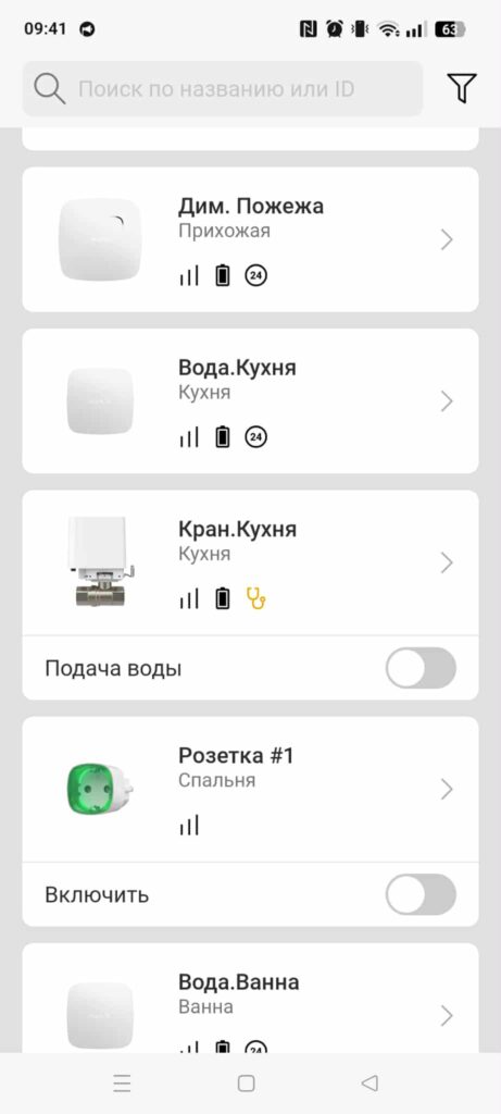 Меню Ajax Security System – це два великі розділи. Один з них містить сповіщення щодо поточного стану заряду, наявність/відсутність зовнішнього живлення, положення (закрито/відкрито) крана та ін.