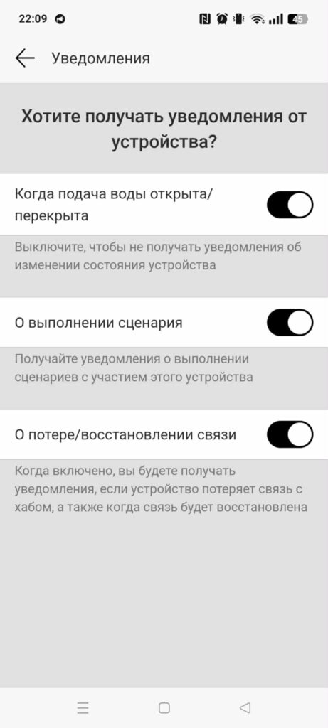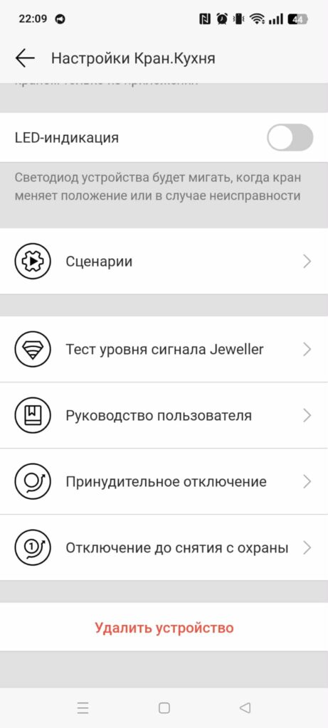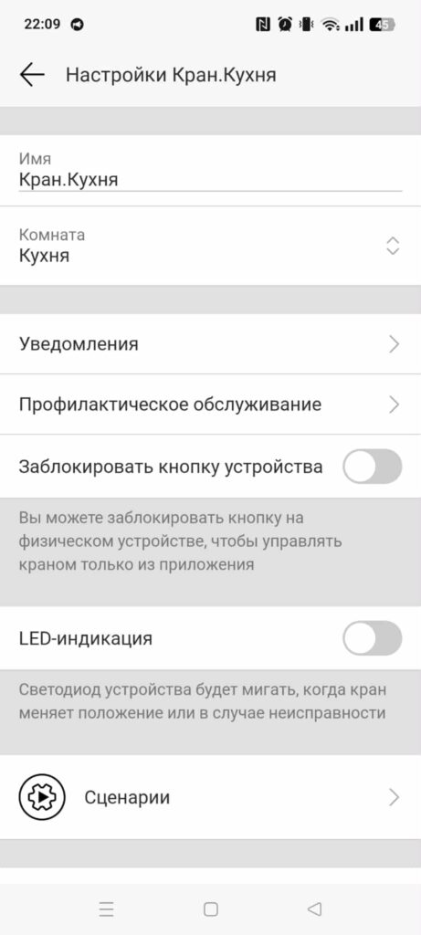 Другий розділ – налаштування. Тут користувач має можливість перейменувати виріб, переназначити кімнату розміщення та багато ін. Крім того, у цьому ж підменю можна заблокувати функціональність кнопки на корпусі крана, активувати роботу LED-підсвітки та ін. Однак найцікавіша особливість даного розділу – можливість налаштувати роботу за сценаріями. Детальніше про це ми говоримо вже у наступному розділі.