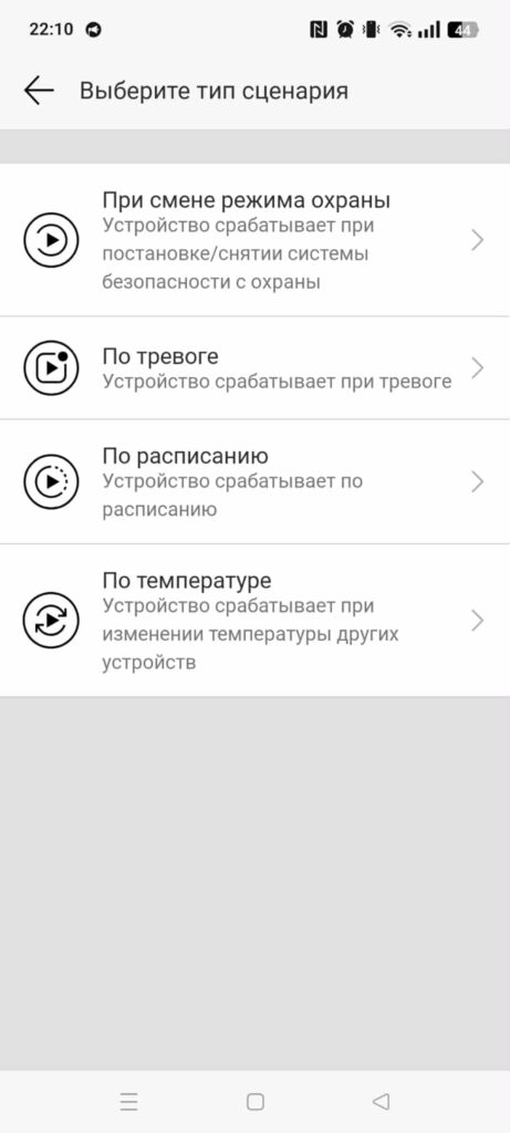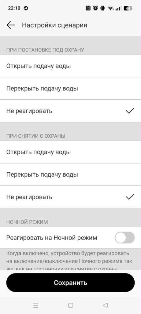 За «умов» першого сценарію з цієї четвірки система закриває кран або ж відкриває його під час встановлення об’єкта на охорону та, відповідно, знаття його з охорони. Стосовно об’єкта – це може бути як ваша квартира, так і будинок чи ж навіть офісне приміщення. Крім згаданого, цей же сценарій передбачає пункт «Реагувати на Нічний режим». Якщо ви активуєте його, система буде діяти за тим же сценарієм, що і під час встановлення на охорону/зняття з неї.