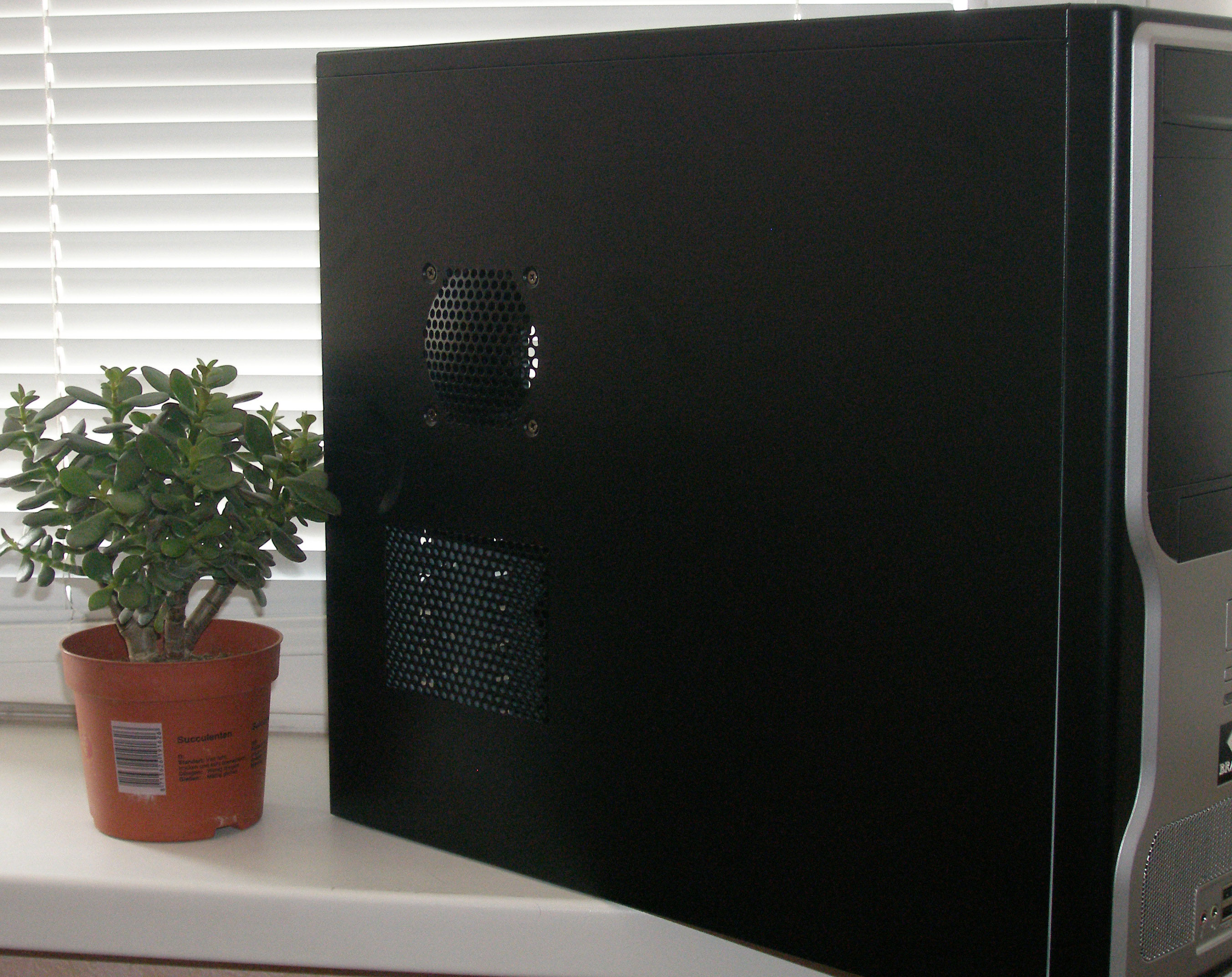 На теле главной боковой панели расположено несколько вентиляционных сеток. Сетки двух форм – кругля и прямоугольная. К внутренней части круглой сетки прикреплена большая пластиковая колба, которая втягивает вентилируемый воздух, тем самым усиливая эффект охлаждения системы.
