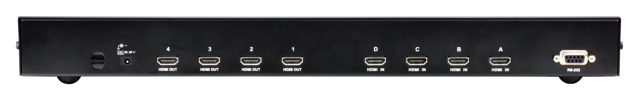 Пульт ДУ и удобные кнопки управления на передней панели VM0404H позволяют быстро выбирать HDMI источники и мониторы, а светодиодные индикаторы указывают, какому дисплею соответствует какой источник. Переключатель также оснащен двунаправленным последовательным интерфейсом RS-232, который позволяет управлять системой с помощью пульта, ПК и/или программного пакета для автоматизации домашнего кинотеатра. Модель VM0404H позволяет быстро и легко переключать HDMI сигналы от источников между выходными портами мониторов через порт управления RS-232.