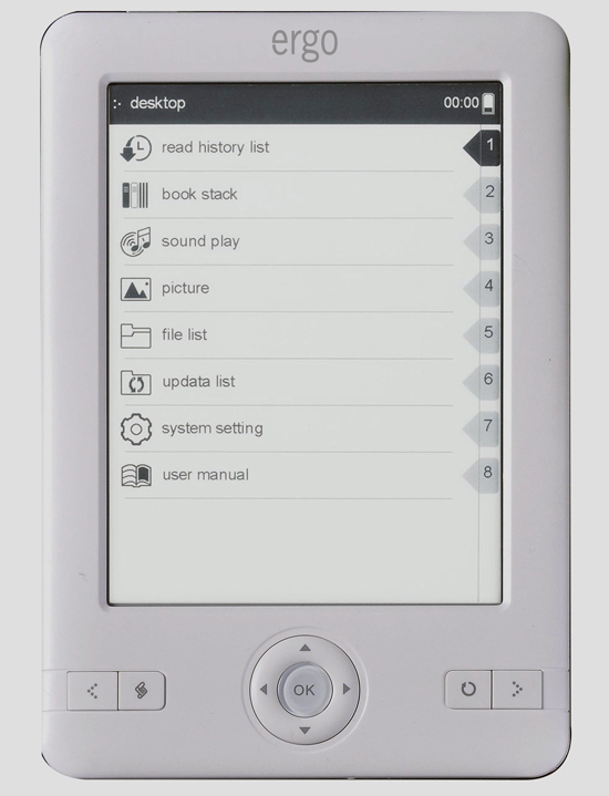 Ergo Book 0602 с большим 6-ти E-Ink дюймовым дисплеем представлен в белом и черном цвете. Основные клавиши управления находятся под экраном. По обеим сторонам экрана расположены кнопки перелистывания страниц, что обеспечивает максимальное удобство при чтении, вне зависимости от того, в какой руке находится букридер.
