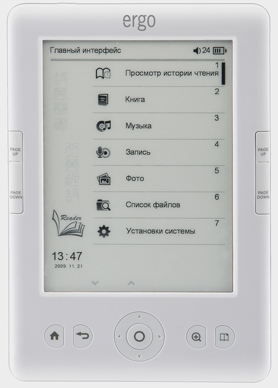 Кроме основных функций: загрузки библиотеки, просмотра изображений и прослушивания музыки, Ergo Book 0602 оснащен функциями диктофона и календаря.