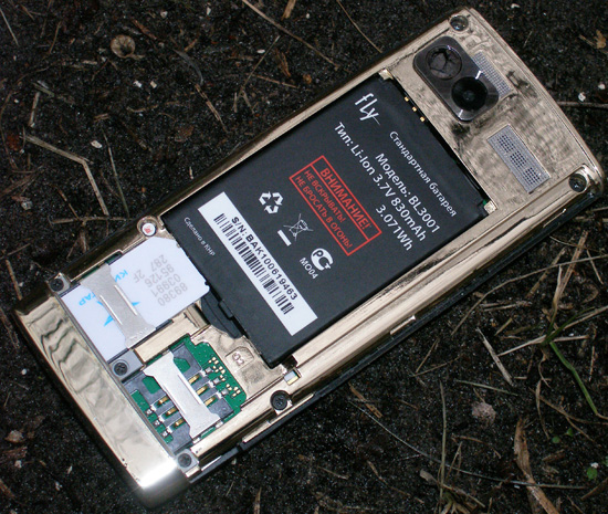 Под крышкой расположен аккумулятор, емкость которого 830 мАч, а под ним, в свою очередь, находится слот для карт расширения памяти. Собственной памяти в устройстве немного – только 440 Кб, а потому без использования карты памяти обойтись врядли получится. Благо в комплекте поставки предусмотрена «флешка», объемом 256 МБ, чего должно хватить на некоторое время. Максимальный объем накопителя, с которым Fly G1 сможет работать – 16 ГБ.