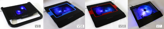 Подставки серии V-Shield имеют следующие размеры: 340 ? 310 ? 59 мм (V3), 345? 340 ? 43 мм (V5R / V5B) и 350? 335 ? 45.5 (V7). Новые модели предназначены для ноутбуков до 15.6”, оснащены двумя тихими вентиляторами 12 см (V3) и 20 см (V5R / V5B и V7) со светодиодами, регулятором скорости вращения, тремя разными вентиляторами 600 — 1000 RPM со встроенным контроллером, а также имеют два USB 2.0 порта.
