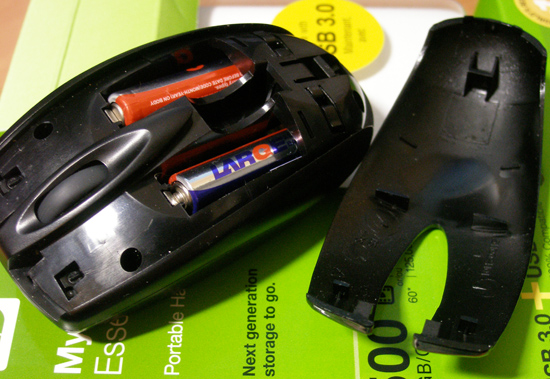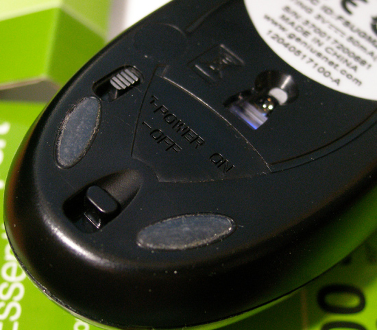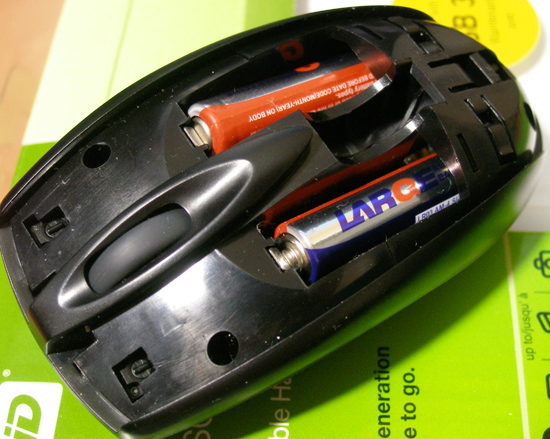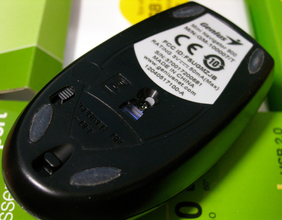 Помимо некой рабочей площадки, верхняя, перламутровавая часть Genius Mini Navigator 900 это еще и своеобразная крышка аккумуляторного блока. Кнопка фиксации крышки расположена на нижней панели. Работает манипулятор от двух пальчиковых батареек, типа ААА. Заменить батарейки, или попросту вставить новые очень просто – необходимо лишь нажать на кнопку-переключатель фиксатора, снять крышку и топливные элементы окажутся в прямой видимости.