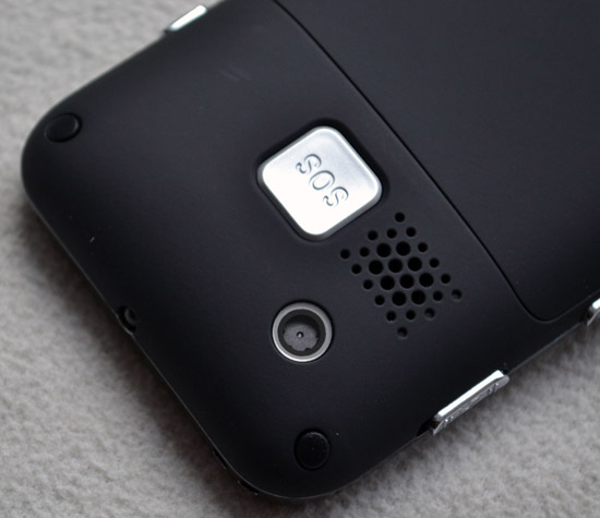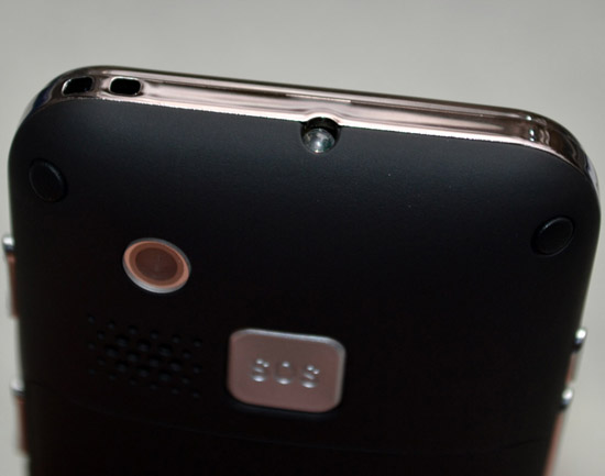 Чуть выше крышки расположена клавиша SOS. Кроме нее, здесь же находятся сетка динамика громкой связи, а также глазок встроенной камеры.