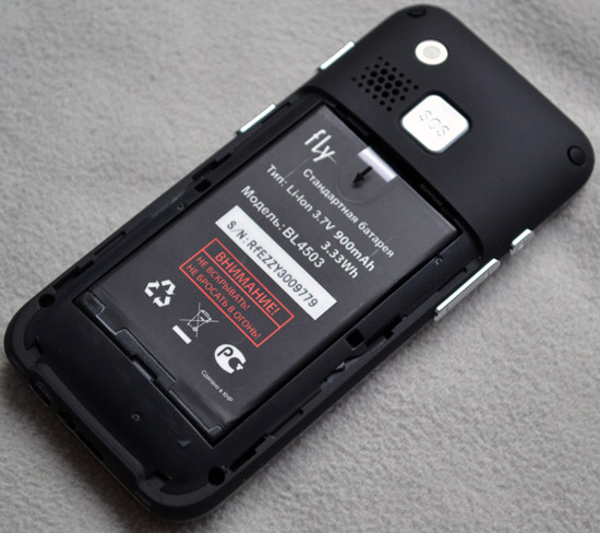 На противоположной панели реализована спаренная кнопка регулирования громкости звука, а также клавиша, отвечающая за блокировку управления. Что любопытно, так этот тот факт, что даже если пользователь предварительно заблокирует Fly Ezzy 3, включить фонарик он все равно сможет. Сделать это можно также и с выключенным питанием телефона.