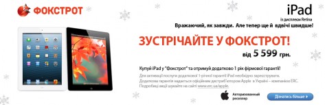На всю продукцию Apple, которая продается в сети «Фокстрот. Техника для дома», распространяется однолетняя гарантия производителя. Более того, купив любую модель iPad в «Фокстроте», потребитель может получить бесплатно дополнительный год гарантии от официального дистрибутора продукции Apple – компании ERC, зарегистрировав купленный iPad на сайте www.erc.ua/apple. Данное предложение действует для iPad всех моделей, которые будут приобретены с 1 декабря по 10 января и зарегистрированы до 15 января 2013 года. Описание и подробности акции — на сайте www.erc.ua/apple.