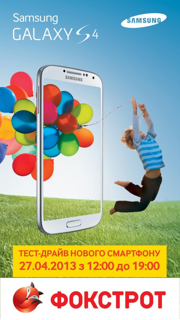 Киев, Харьков и Львов первыми увидят это новое произведение технического искусства от компании Samsung Electronics в действии. 27 апреля с 12:00 до 18:00 будет проходить тест-драйв четвертого поколения флагманской линейки GALAXY S – смартфона GALAXY S 4 в магазинах «Фокстрот» по адресам: